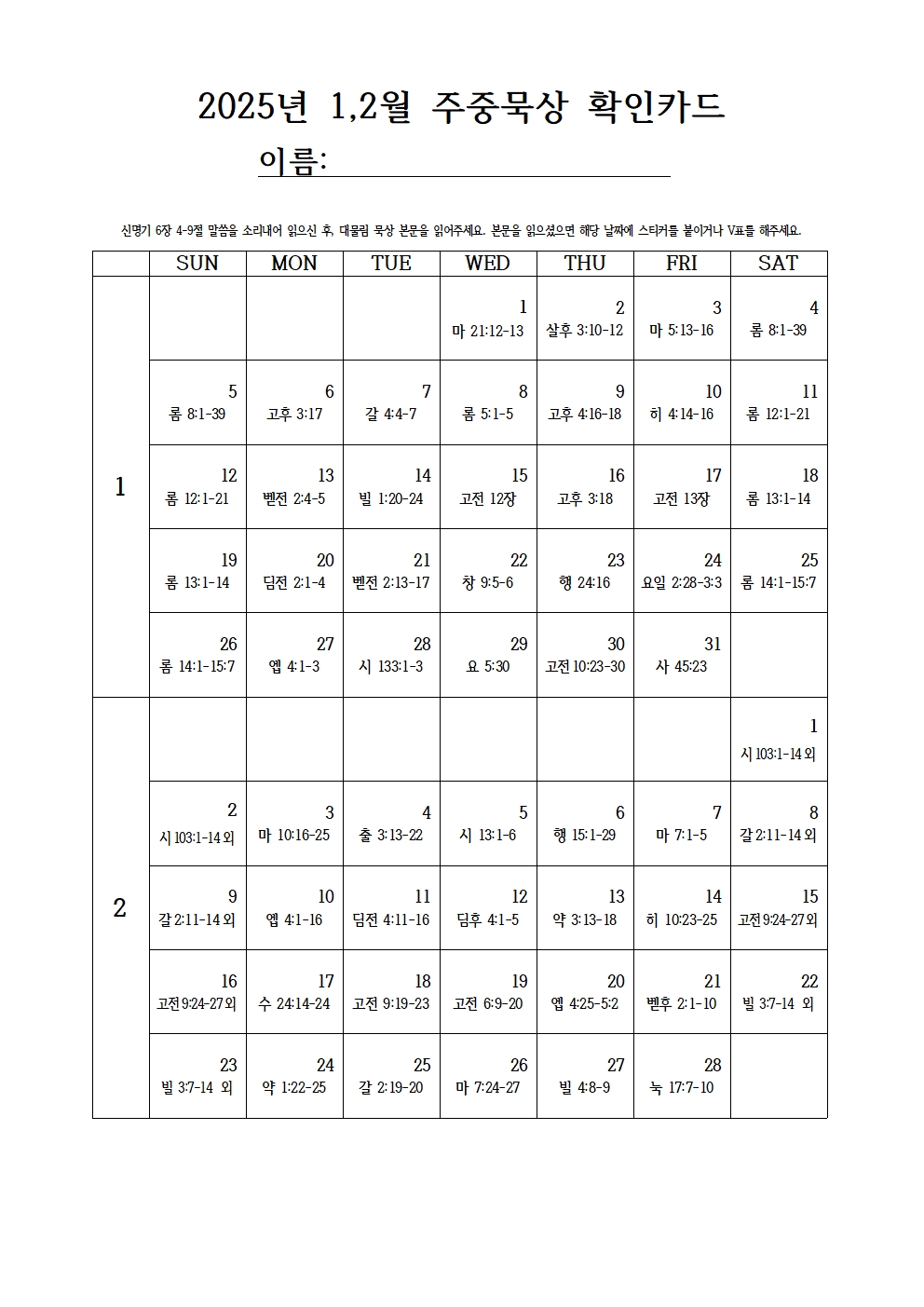 20250105 교회소식 및 주보 (2025년 1.2 주중묵상 확인 카드)