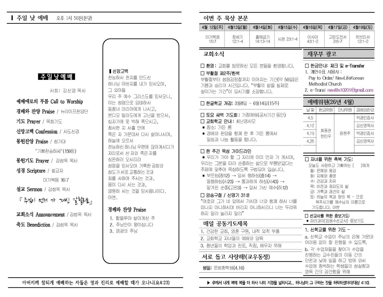 2026년 4월 12일 교회소식 및 주보