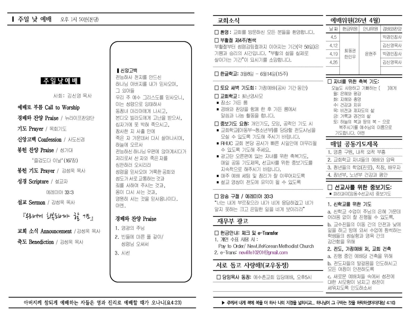 2026년 4월 26일 교회소식 및 주보